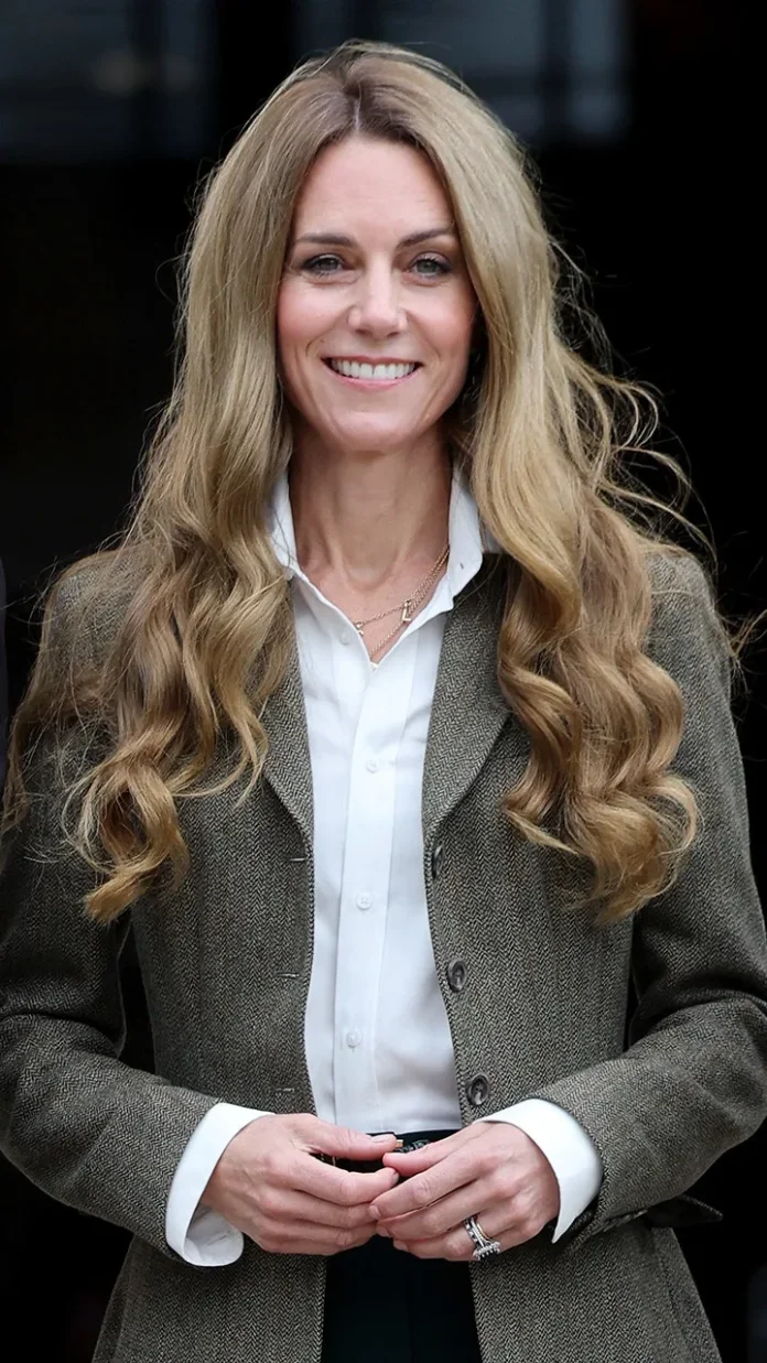 2024: Tonos miel cálidos post-quimio (marzo diagnóstico; no cold cap, pérdida total). En abril (aniversario 14 con William), rubio más claro en Isla de Mull.