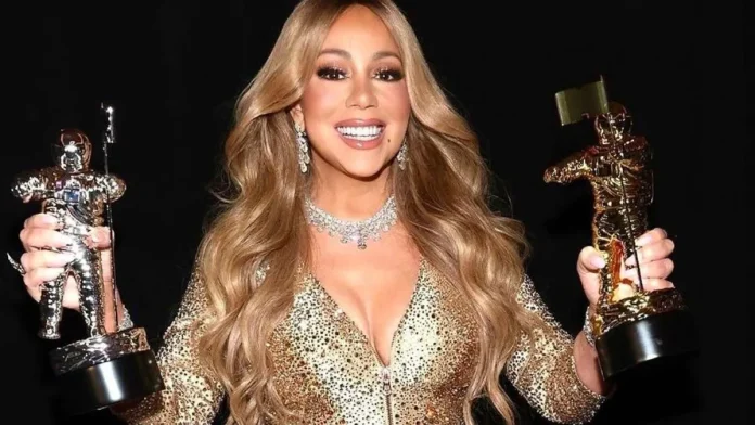 Mariah Carey fue homenajeada con el Video Vanguard Award, entregado por Ariana Grande, en reconocimiento a su extensa trayectoria y profundo impacto en la música y la cultura pop. Durante el evento, Carey interpretó un medley con algunos de sus mayores éxitos, marcando su vuelta a los VMAs después de 20 años. Su entrada fue con una bata de seda dorada con detalles de plumas que luego retiró para revelar el brillante romper dorado y las joyas deslumbrantes.